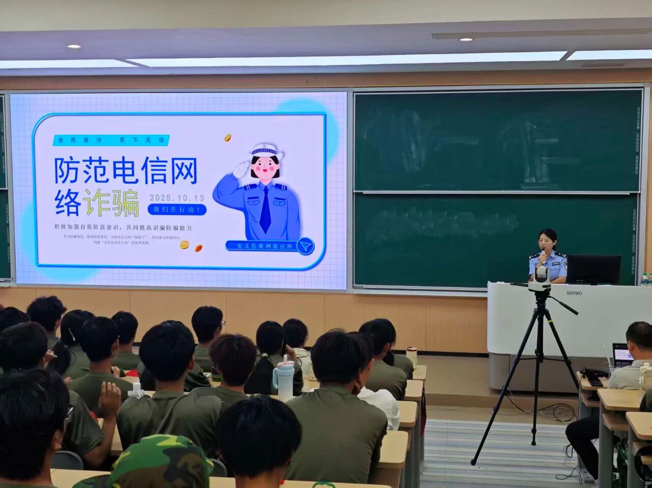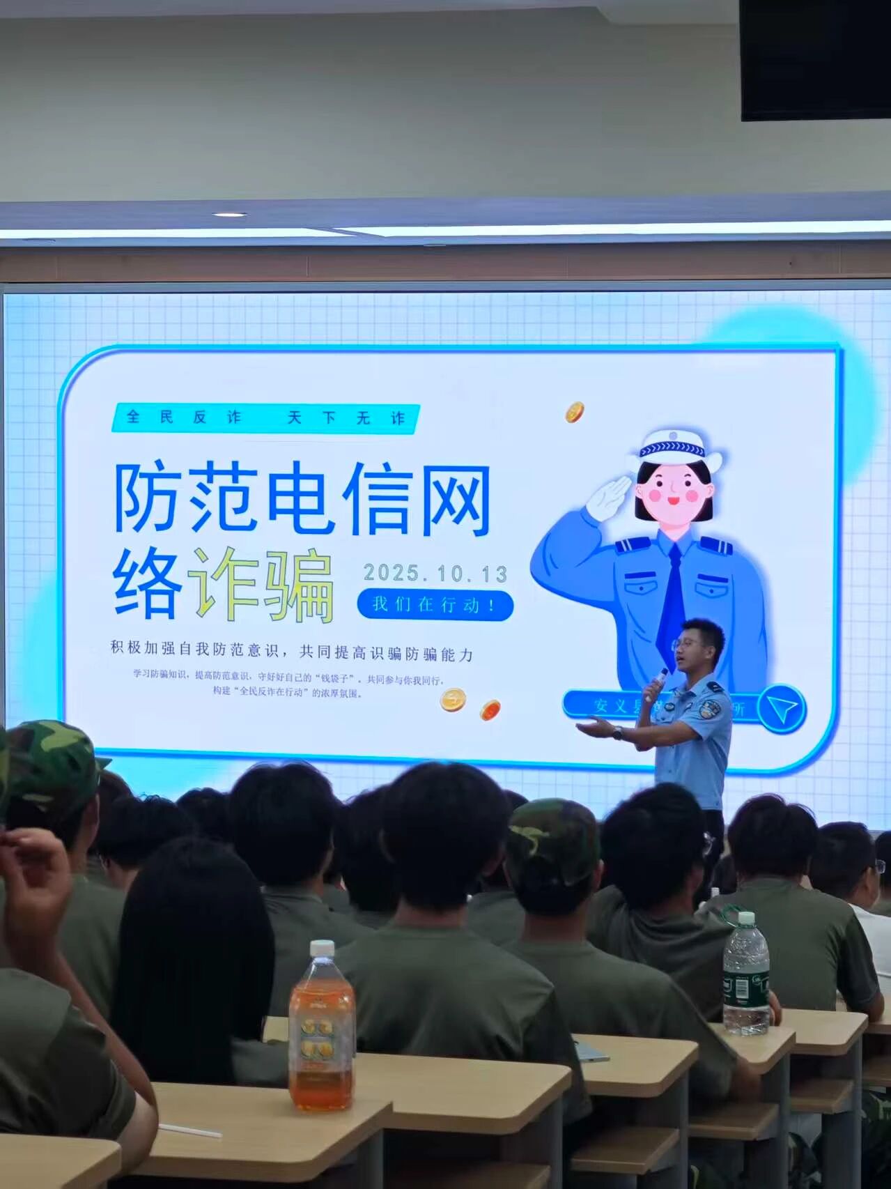 为扎实做好2025级新生安全教育工作,进一步提升师生反诈意识,强化网络安全观念,近日,学校保卫处联合学工处组织开展新生安全教育第一课活动。活动邀请了安义县公安局黄洲派出所所长赵健、教导员刘秀娟、辖区民警张维中到校进行现场安全教育、开展反诈宣传,学校教学基地工作专班、保卫处、学工处、2025级新生共4800余人通过线上+线下的方式聆听讲座。
