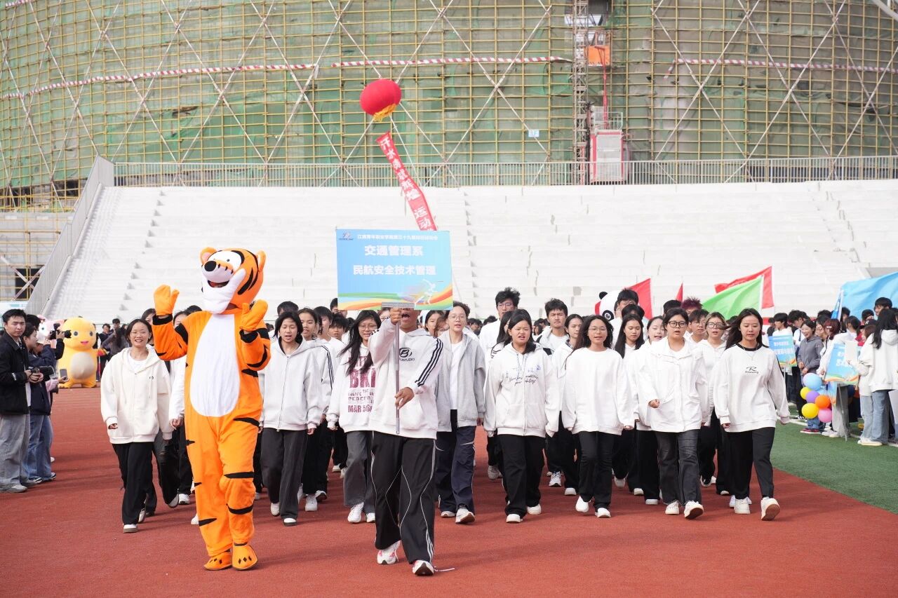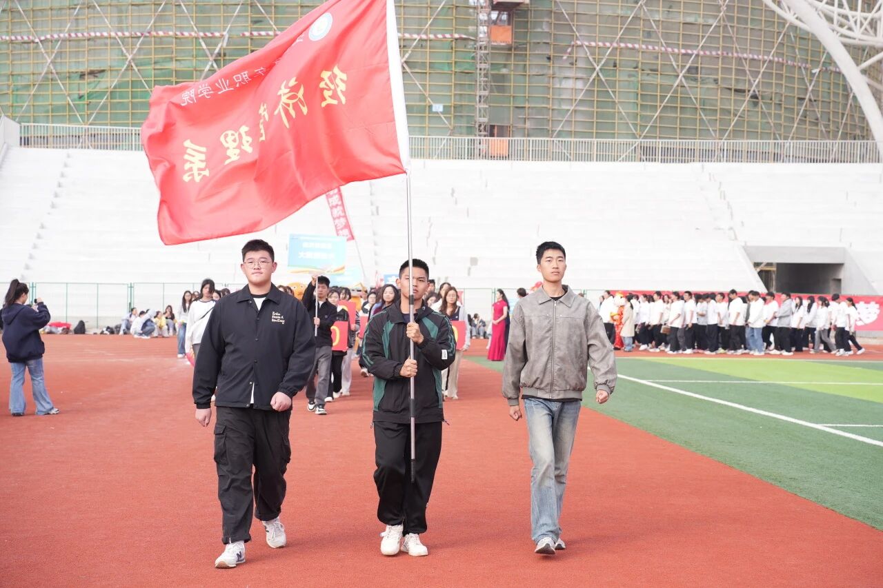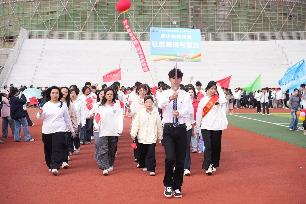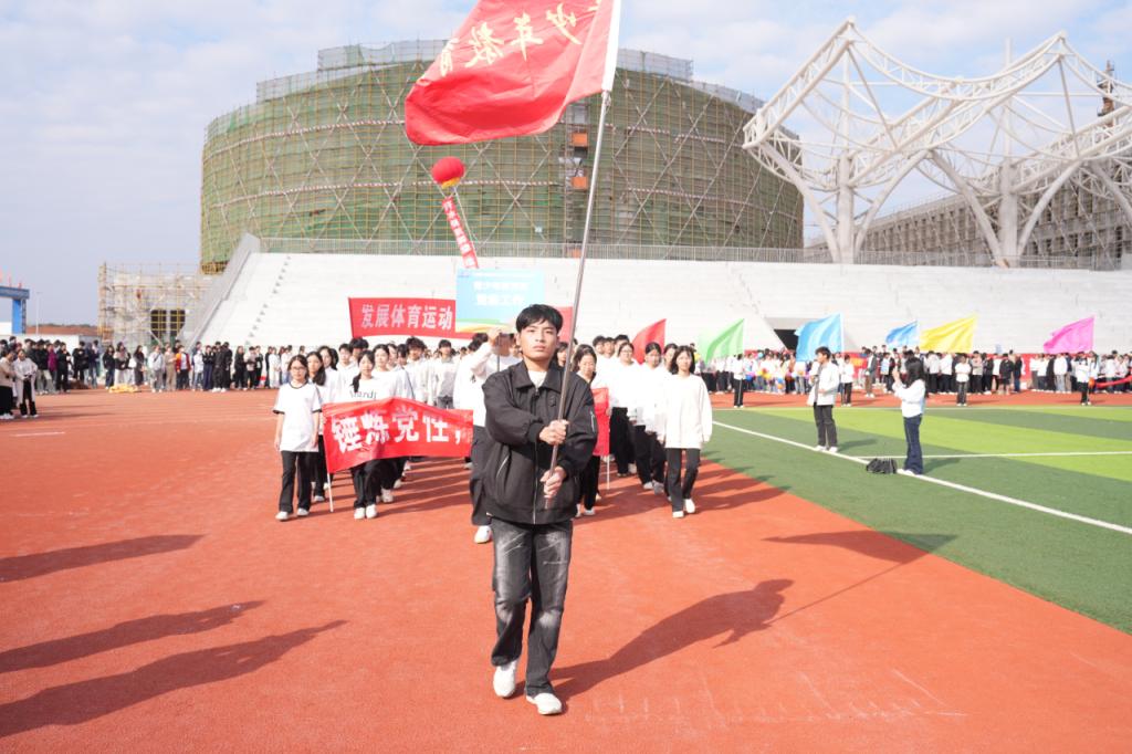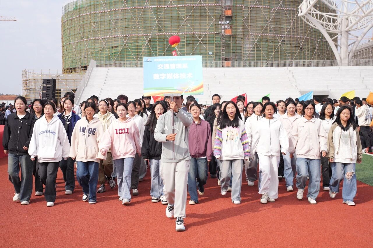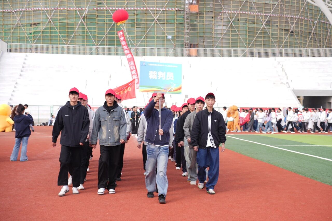 “青春・集结”篇章以庄重仪式拉开序幕。国旗队、会旗队迈着铿锵步伐率先入场,各系运动员方阵与裁判员队伍依次跟进——不少方阵手持契合专业特色的道具,变换创意队形传递青春巧思。“青春无畏,逐梦扬威”“团结拼搏,超越自我”此起彼伏的嘹亮口号响彻运动场,青院学子积极向上、团结奋进的精神风貌跃然眼前。