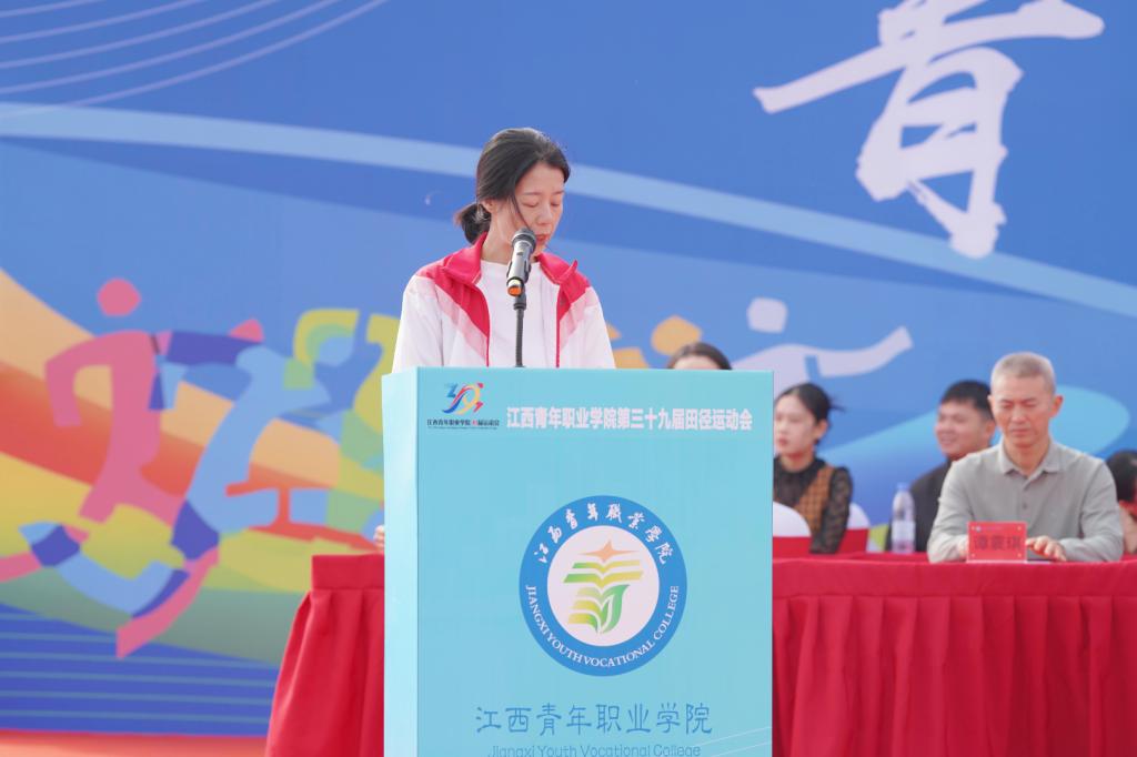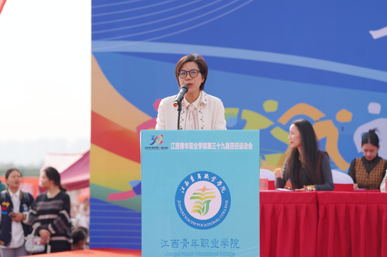 “逐梦・启航”篇章中,伴随《义勇军进行曲》激昂奏响,全场肃立,五星红旗冉冉升起,爱国情怀与青春热血在运动场交织激荡,将“家国情怀”深植体育场景。党委副书记邵婷婷在开幕词中指出,运动会既是体育竞技平台,更是落实立德树人根本任务的实践载体、检验师生综合素质的“试金石”。她鼓励运动员弘扬奥林匹克精神,在挑战自我中收获友谊、锤炼品格,明晰参赛意义与成长方向。随后,运动员代表承诺“遵守规则、赛出水平、尊重对手”,裁判员代表表态“坚守公正、精准裁决、保障赛事公平”,誓言掷地有声。