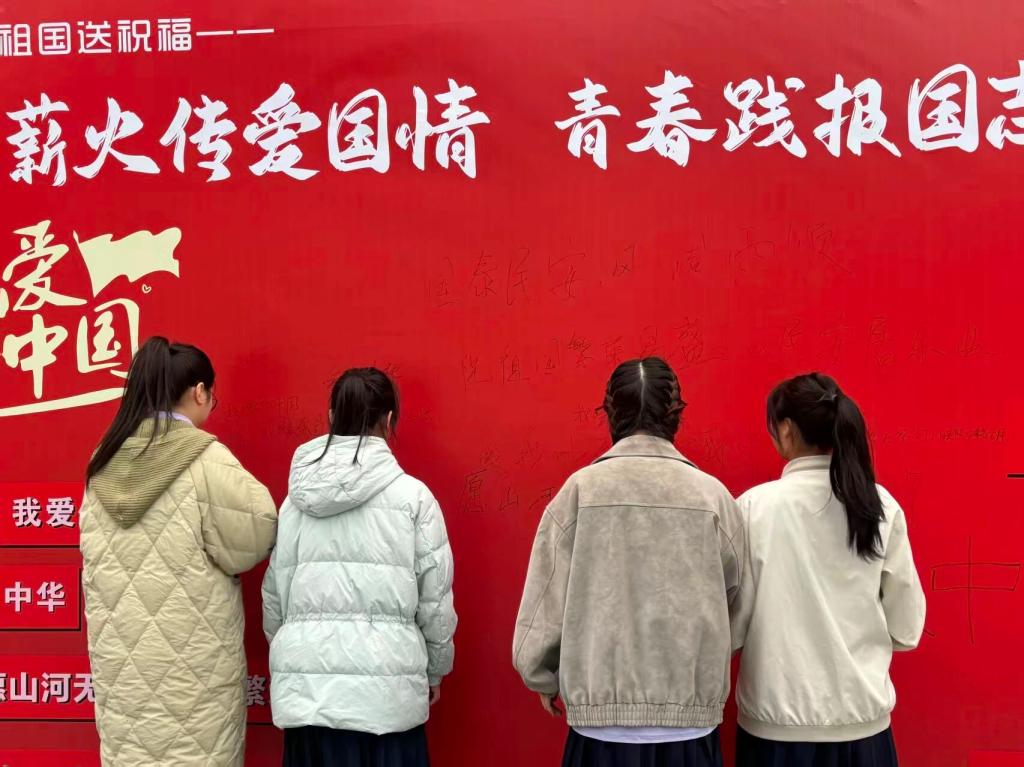 本次系列活动以一场庄严肃穆的升旗仪式正式拉开序幕。10月20日,迎着朝阳,全体师生整齐列队,面向国旗肃立致敬。升旗仪式后,学生代表身着整齐校服,激昂诵读《少年中国说》经典选段,“少年强则国强”的铿锵誓言回荡校园,传递出新时代青年的强国使命与责任担当;随后,全体师生共同唱响《我和我的祖国》,悠扬而深情的旋律浸润人心,将现场氛围推向高潮。在“爱国主义祝福墙”互动环节中,师生们纷纷提笔,将对祖国繁荣昌盛的期盼、对学校发展的祝福、对个人未来的期许一一书写于墙面,每一笔都饱含真情,每一字都凝聚热爱。