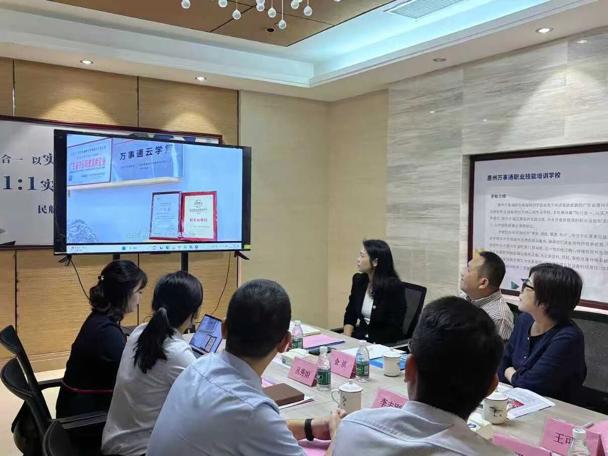 调研期间,刘英一行观看了企业宣传视频及简介材料,系统了解万事通航空的发展历程、业务布局及航空地勤人才培训体系。随后校企双方在T1航站楼会议室展开座谈。会上,企业方详细分享了在航空地勤服务、职业技能培训领域的优势成果,特别提及当前实习生的在岗表现与成长情况;我校代表则从交通管理系专业建设、人才培养模式及学生就业方向等维度作介绍。围绕“校企共建实训基地”“定制化人才培养路径”“实习生日常管理与保障”等核心议题,双方深入交换意见,达成多项共识。