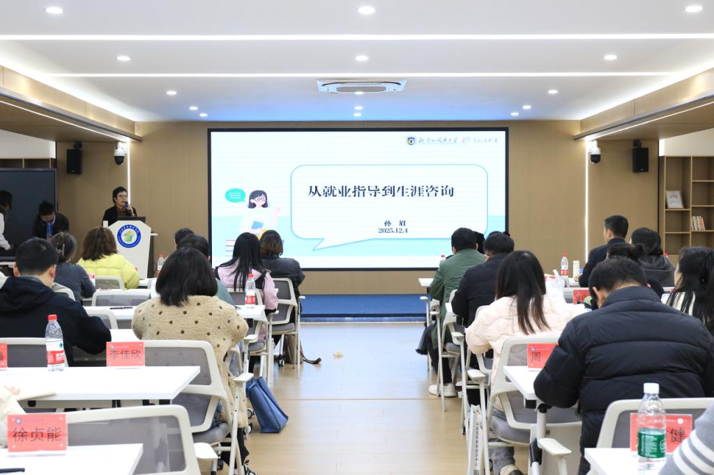 同日下午,北京外国语大学西葡语学院党总支书记、予玫工作室创始人孙眉带来《从就业指导到生涯咨询》的深度分享。讲座中,她清晰梳理了传统就业指导向现代生涯咨询转型的核心逻辑,提出以学生为中心的个性化服务理念,详细介绍了生涯咨询的核心技术、沟通技巧与案例处理方法。结合自身的实践经验,她分享了如何联动学校资源构建全员协同的生涯咨询服务体系,帮助参训教师提升从“问题解决”到“成长赋能”的专业能力。