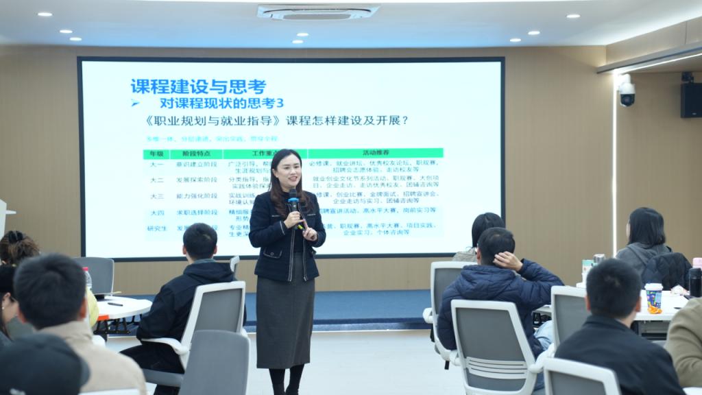 12月5日上午,广东工业大学心理健康教育中心副主任范梦主讲《职业生涯规划与就业指导课程设计》。讲座中,她围绕课程目标定位、模块设置、教学方法创新、考核方式优化等核心内容,结合自身的教学经验,分享了如何将赛事元素融入日常教学,如何通过案例教学、情景模拟、小组实践等形式提升课程吸引力与实效性,为高校构建科学完善的生涯教育课程体系提供了可直接借鉴的实操方案。