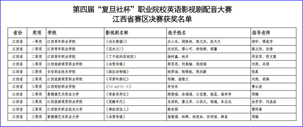 近日,在第四届“复旦社杯”职业院校英语影视剧配音大赛江西省赛区决赛中,我校学子凭借扎实的语言功底、生动的艺术表现及良好的团队协作精神,在全省职业院校中脱颖而出,荣获一等奖1项、二等奖2项。