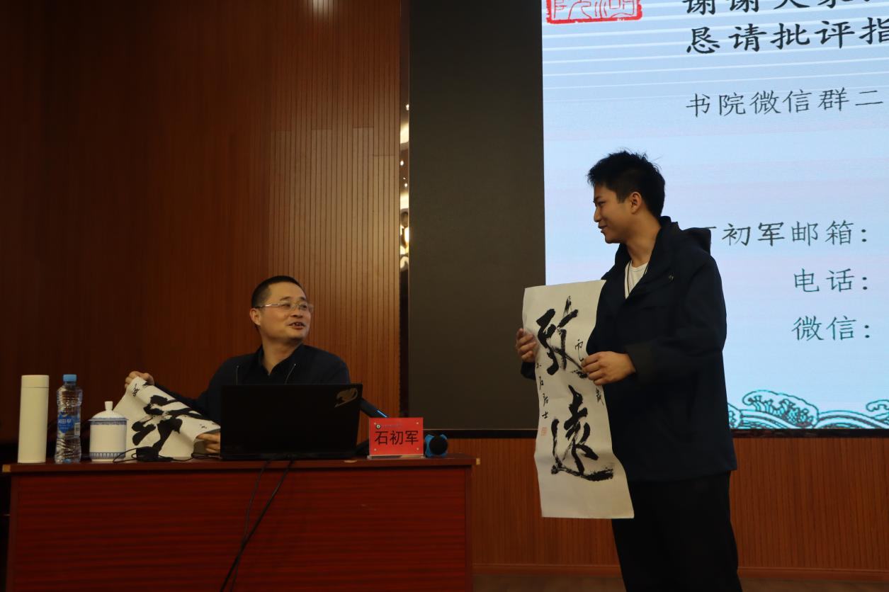 互动答疑环节,同学们踊跃提问。问题围绕“小善与大善的内涵”“孔子推崇‘仁’的深意”“为何易对友人友善却难待父母至亲” 等现实困惑。石初军结合经典与生活,逐一细致解答、给出务实指引。讲座尾声,他还向现场学生赠送个人墨宝,以笔墨寄寓期许,勉励大家深耕经典、向善向美。