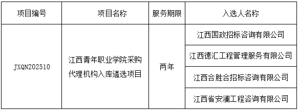 江西青年职业学院采购代理机构入库遴选项目(项目编号:JXQN202510)以公开遴选的方式,遴选社会采购代理机构。遴选活动于2025年10月23日09:00时在江西青年职业学院实训楼305举行,经遴选小组评审,采购人确认,遴选结果如下(排名不分先后):