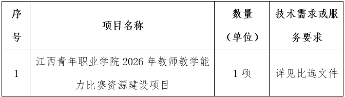 江西省安澜工程咨询有限公司受江西青年职业学院的委托,就江西青年职业学院2026年教师教学能力比赛资源建设项目(比选编号:JXAL2026-F123)进行公开比选,欢迎符合资格条件的比选申请人参加比选。